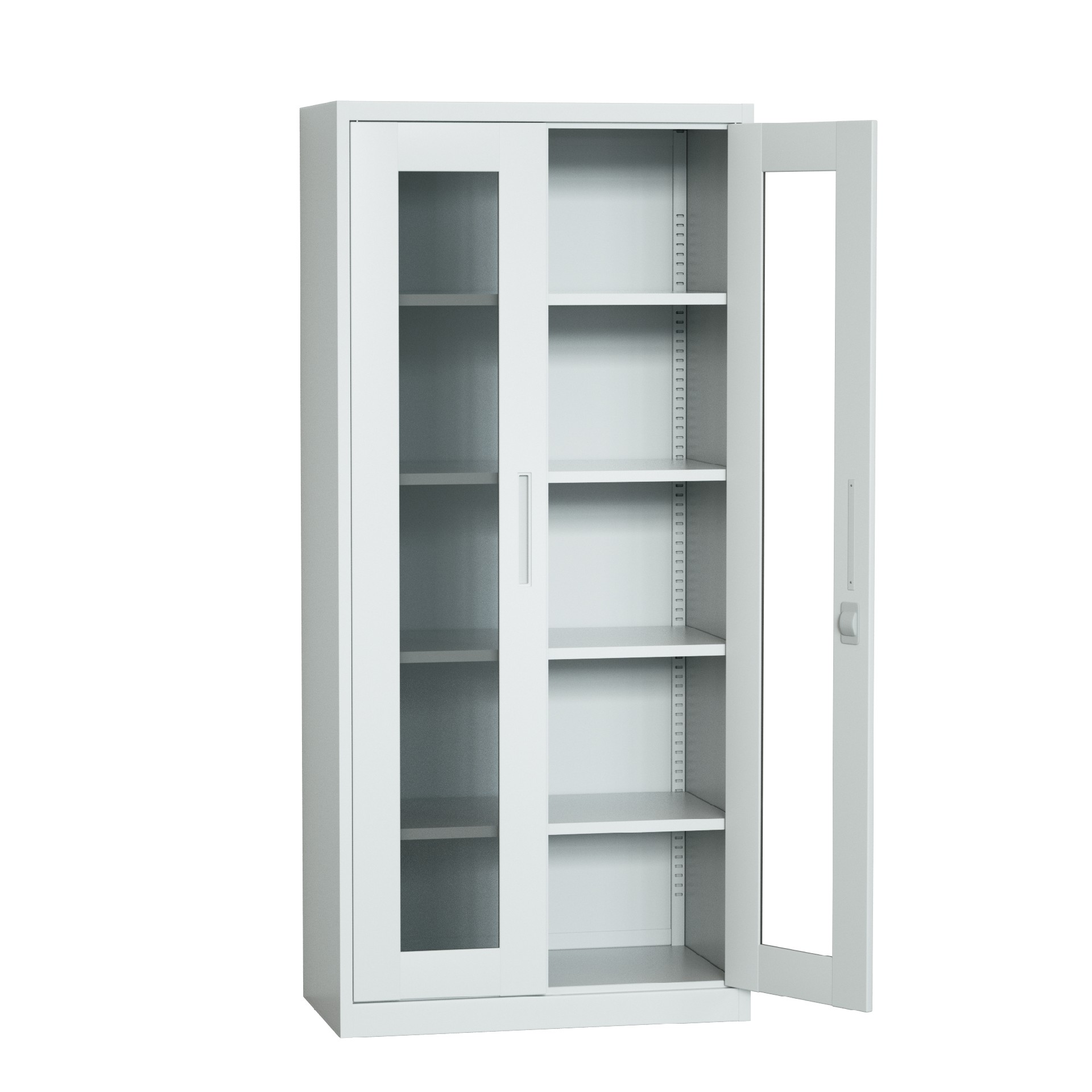 Clear glass doors allow for quick identification and finding out what's inside. Swing doors ensure smooth opening and closing. This filing cabinet with four adjustable shelves lets you organize your files neatly into different categories.